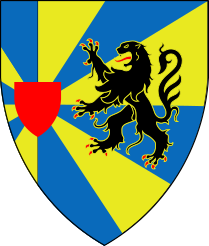 D'azur à la fasce crénelée d'argent accompagné en chef d'un soleil éteint de huit rayons d'or chargé d'un croissant de sable et en pointe de deux épées passées en sautoir les pointes en bas d'or.