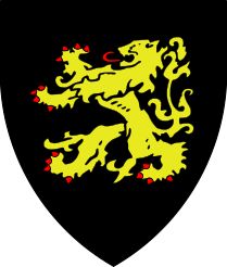 De tenné à une couronne triomphale de sinople et à la bordure de carnation, et brochant sur le tout: une auréole de fer de carnation (à enquerre).