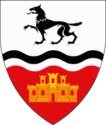 Écartelé de sable et de pourpre à un navire d'argent brochant sur le tout, adextré en chef d'un croissant versé du même.