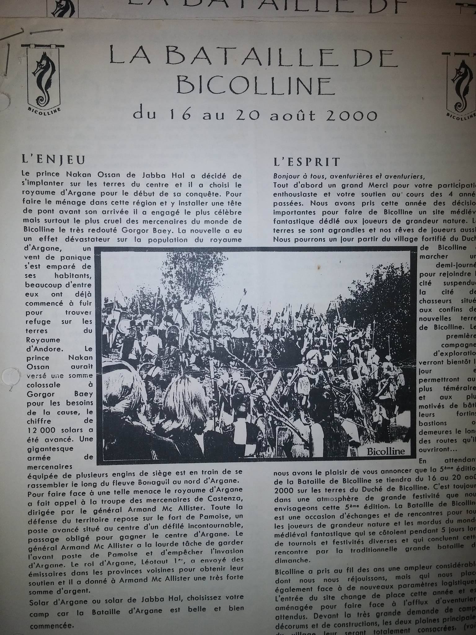 Le prince Nakan Ossan de Jabba Hal a décidé de s'implanter sur les terres du centre et il a choisi le royaume d'Argane pour le début de sa conquête. Pour faire le ménage dans cette région et y installer une tête de pont avant son arrivée il a engagé le plus célèbre mais surtout le plus cruel des mercenaires du monde de Bicolline le très redouté Gorgor Baey. La nouvelle a eu un effet dévastateur sur la population du royaume d'Argane, un vent de panique s'est emparé de ses habitants, beaucoup d'entre eux ont déjà commencé à fuir pour trouver refuge sur les terres du Royaume d'Andore. Le prince Nakan Ossan aurait versé une somme colossale à Gorgor Baey pour les besoins de la cause, le chiffre de 12 000 solars a été avancé. Une gigantesque armée de mercenaires équipée de plusieurs engins de siège est en train de se rassembler le long du fleuve Bonaguil au nord d'Argane. Pour faire face à une telle menace le royaume d'Argane a fait appel à la troupe des mercenaires de Castenza, dirigée par le général Armand Mc Allister. Toute la défense du territoire repose sur le fort de Pamoise, un poste avancé situé au centre d'un défilé incontournable, passage obligé pour gagner le centre d'Argane. Le général Armand Mc Allister a la lourde tâche de garder l'avant poste de Pamoise et d'empêcher l'invasion d'Argane. Le roi d'Argane, Léotaut 1er, a envoyé des émissaires dans les provinces voisines pour obtenir leur soutien et il a donné à Armand Mc Allister une très forte somme d'argent. Solar d'Argane ou solar de Jabba Hal, choisissez votre camp car la Bataille d'Arganne est bel et bien commencée.