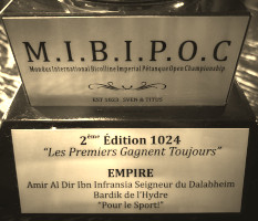 finale du MIBIPOC (Mondus International Bicolline Imperial Pétanque Open Championship), le tournoi de pétanque organisée par l'Ozame, est remplie de célébrités: le Seigneur Amir affronte le Roi Sven, et la partie est arbitrée par nul autre que Son Altesse Sérénissime Karl. Sur le dernier coup, alors que le Roi a la partie en main, il choisit de tirer « Pour le sport! » plutôt que de s'abstenir, et donne la victoire à notre Bon Seigneur Amir et son coéquipier Bardik de l’Hydre. Vive le sport et merci à notre Seigneur pour la remise des solars gagnés au trésor de la guilde!