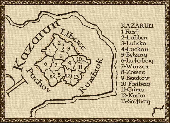 Kazarun signifie «étoile du sud» en fehlef. Fondée en 796 par la grande tribu des Felfel-Aswad Kazarun devient rapidement une cité d’importance. Développée dans une enclave du fleuve d’Ourgadun, elle bénéficie d’un climat privilégié pour cette partie des Terres du Sud. Durant près d’un siècle, la renommée de Kazarun ne fit que grossir et s’étenda jusqu’au centre de l’Empire. Mais ce siècle de prospérité prit fin petit à petit avec l’arrivée de nombreuses tribus de Barbares, ayant une toute autre conception de l’hospitalité et de la vie. Les choses se dégradèrent rapidement et un règne de terreur s’y installa pendant de nombreuses années.