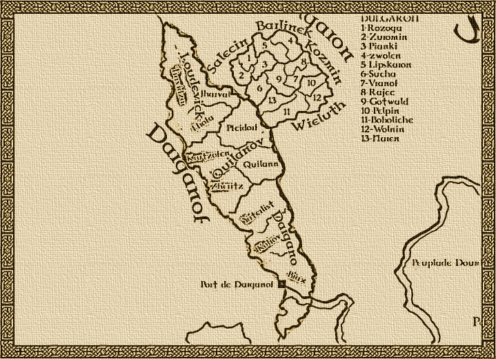 Darganof est une gigantesque région côtière s’étendant sur 400 lieux du Nord au Sud des Terres du Sud. La population de Darganof est communément appelée les Dasgovites. L’embouchure du fleuve d’Ourgadun traverse la ville de Brax qui abrite également le port de Darganof. Ce port est l’un des trois plus important de la mer des deux îles, mais également le port d’échange et de commerces le plus utilisé avec tous les émirats du Sud de la Cité des Sables. Il transige quantité de marchandises par le fleuve d’Ourgadun qui relie le quartier portuaire de Mehl au port de Darganof.
