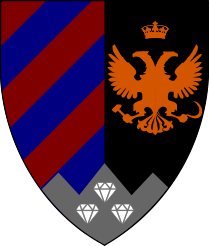 Parti, au premier barré de gueules et d’azur, au second de sable à une aigle bicéphale éployée empoignant à dextre un marteau et à senestre une faucille, surmontée d’une couronne, le tout d’orangé; et brochant sur le tout mouvant de la pointe : une montage de fer à trois coupeaux chargée de trois diamants d’argent mal ordonnés.