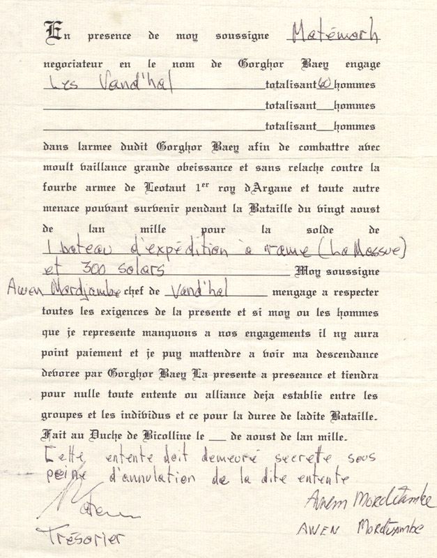 Le fameux contrat signé entre Gorghor Baey et les Vand'Hals pour l'engagement de ceux-ci dans l'armée d'invasion de l'Arganne en l'an 1000. Les Vand'Hals profitèrent de la clause finale pour révéler publiquement leur engagement dans une tentative de se défaire de leurs obligations. Ce ne fut pas cette interprétation qui fut retenue par Gorghor Baey, ce qui mena à de graves conséquences (telles qu'énumérées sur le contrat) pour les Vand'Hals et une rivalité qui dura plusieurs années.