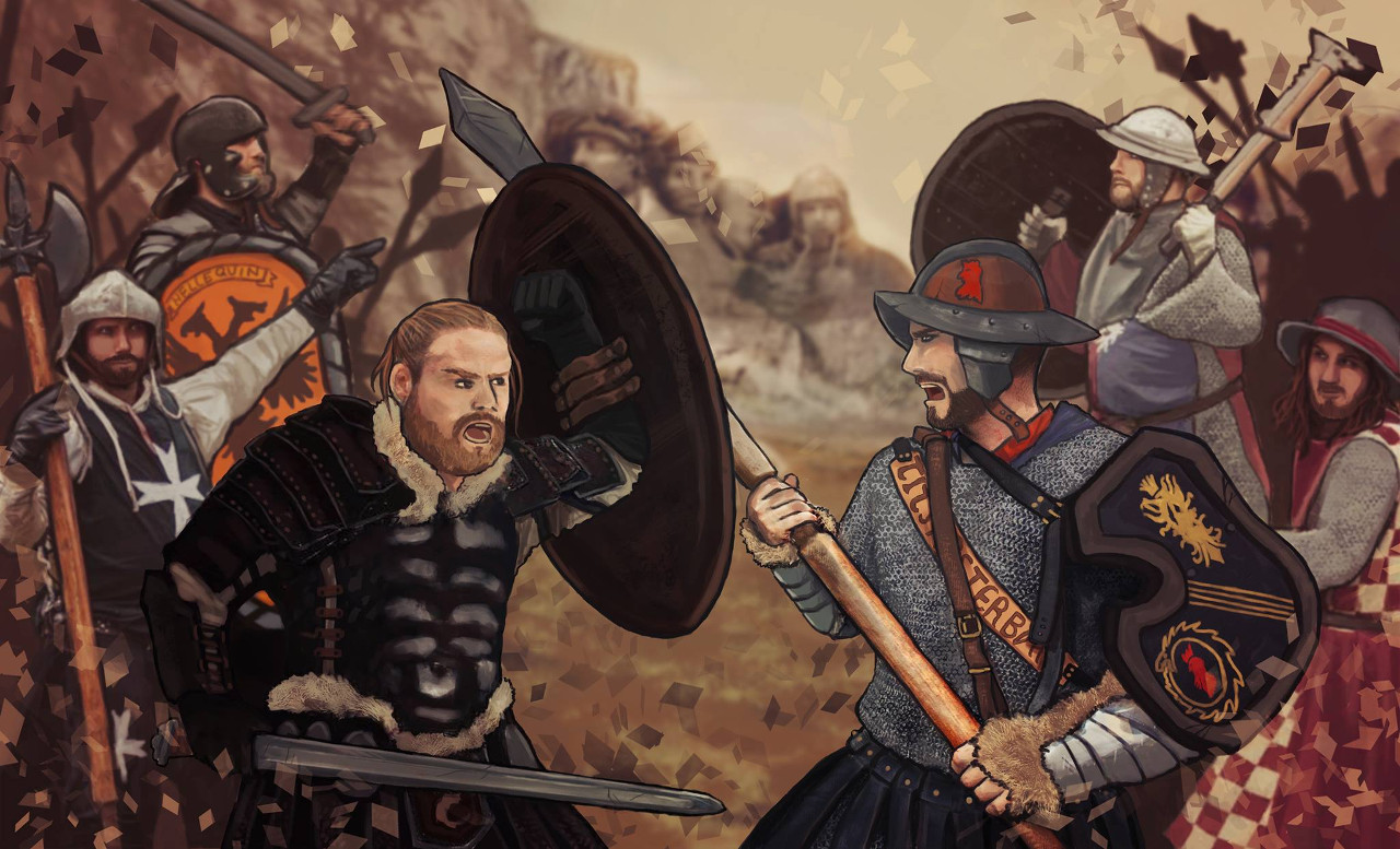 Une fresque inspirée de la campagne militaire Bras de fer aux abords de la mer du centre qui opposa la Coque rouge au Ragnarok. Au premier plan, Thornstein du Ragnarok affronte Dilios de la Coque rouge. Du côté de Ragnarok on reconnait Dorian de la Rédemption et Oulianov des Hellequins. Du côté de la Coque rouge, Romulus et Alphonse de la Vigne.
