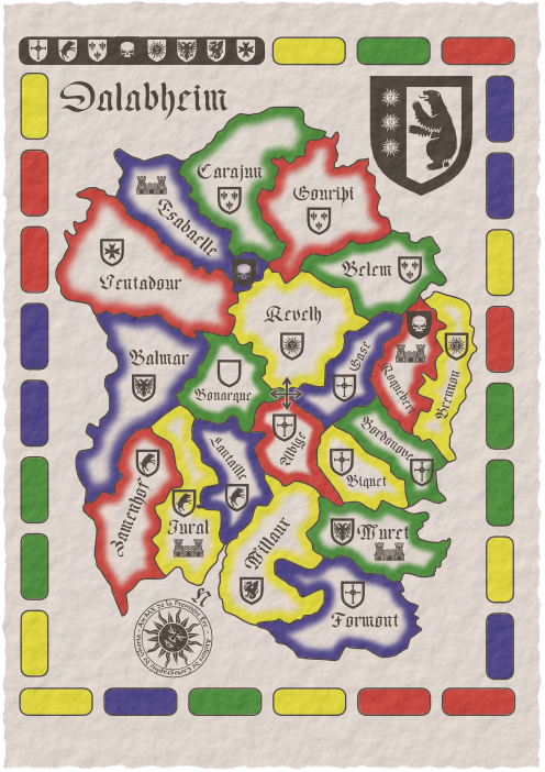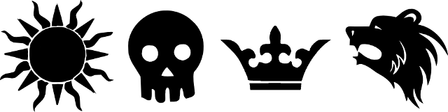 symboles: Ghoria (le soleil), Dalabheim (l'ours), la mort (le crâne) et