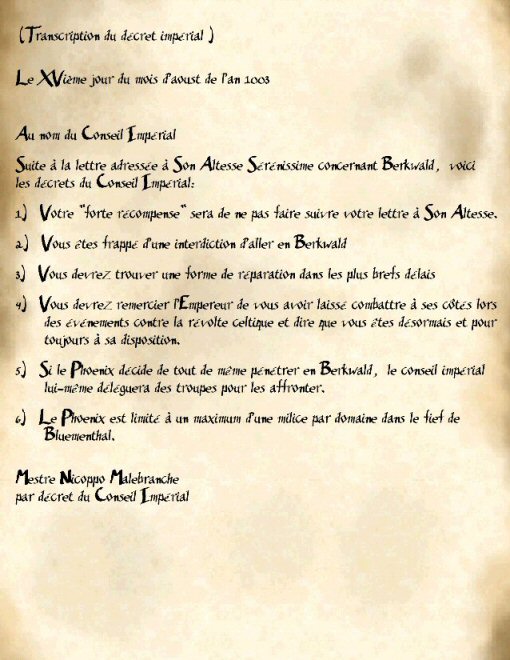 La réponse du Conseil Impérial à la missive du Phoenix, dans laquelle le Prince Gabriel 1er annonce l'invasion de Berkwald